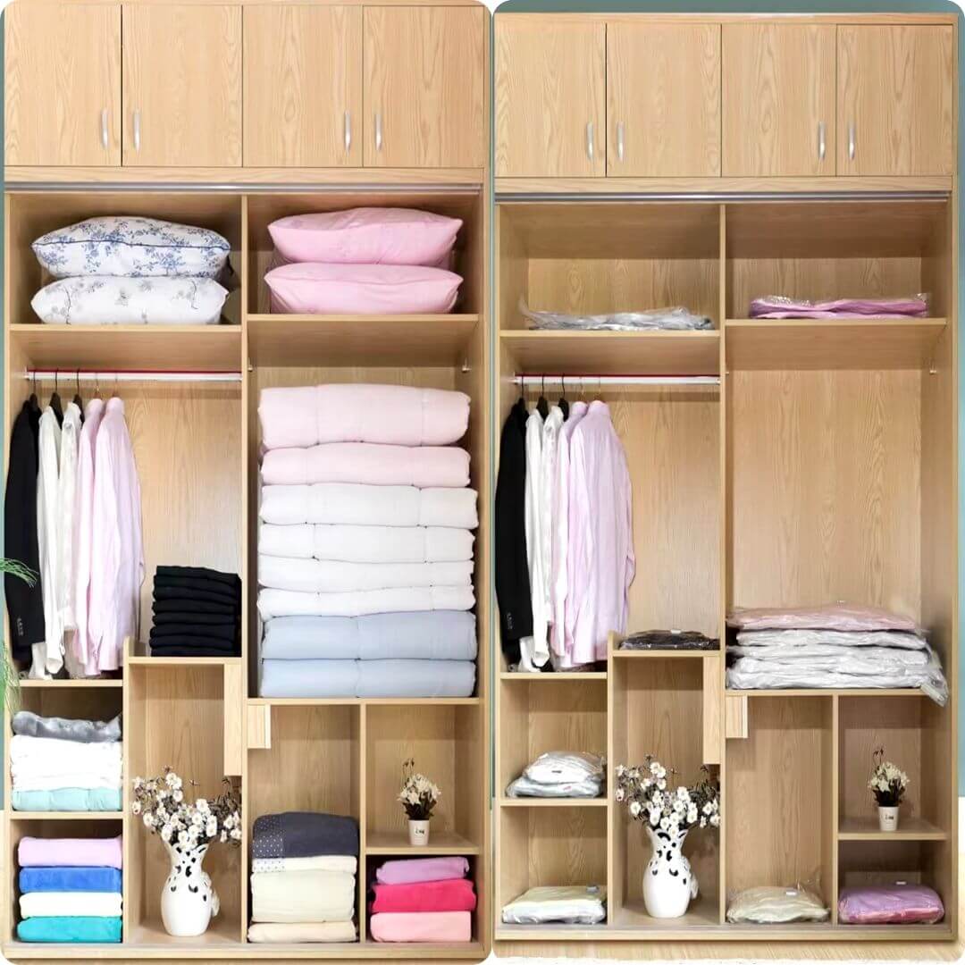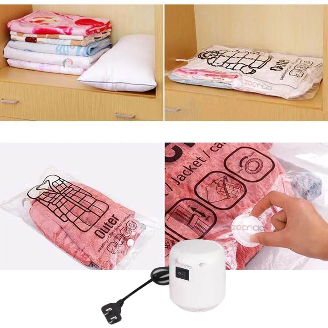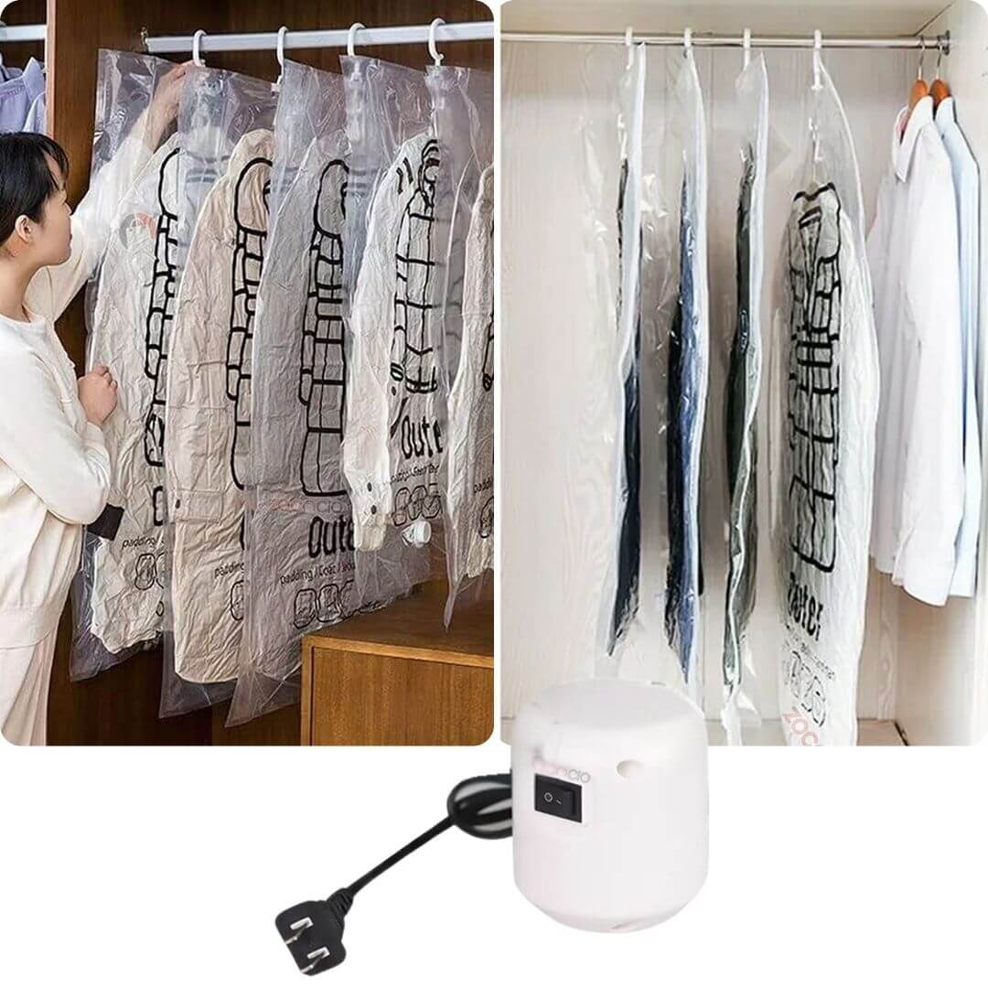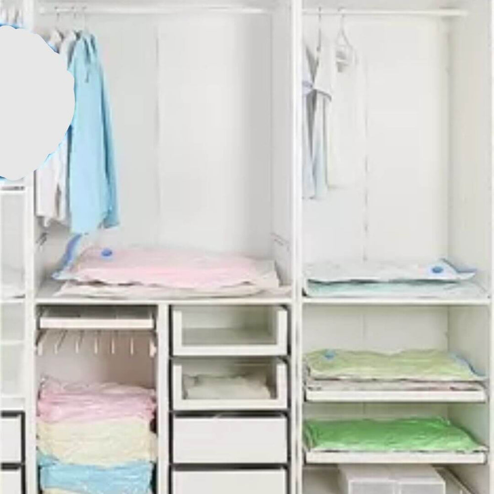 Nuestras bolsas de almacenamiento al vacío liberan espacio al máximo, preservando cada prenda en perfecto estado. ¡Ideal para tus mejores trajes, chaquetas y cobijas o sabanas!