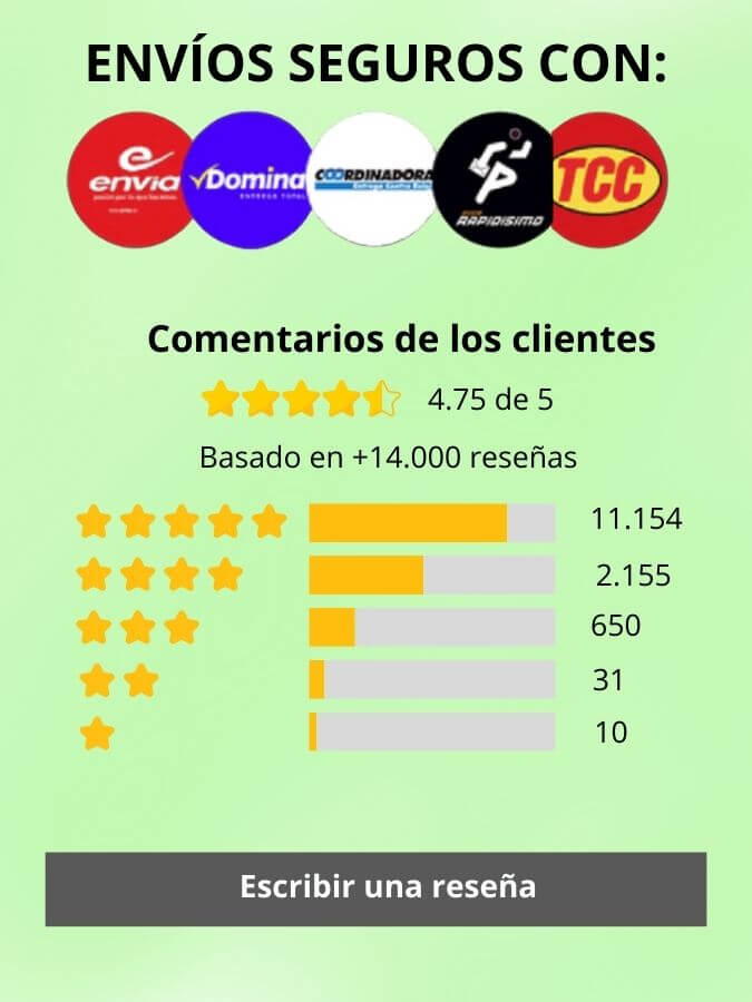 OTRAS CIUDADES:Esto puede variar según los transbordos que tenga que hacer la transportadora (puede ser más de 10 días). No hacemos envíos a veredas, la transportadora no nos presta ese servicio.